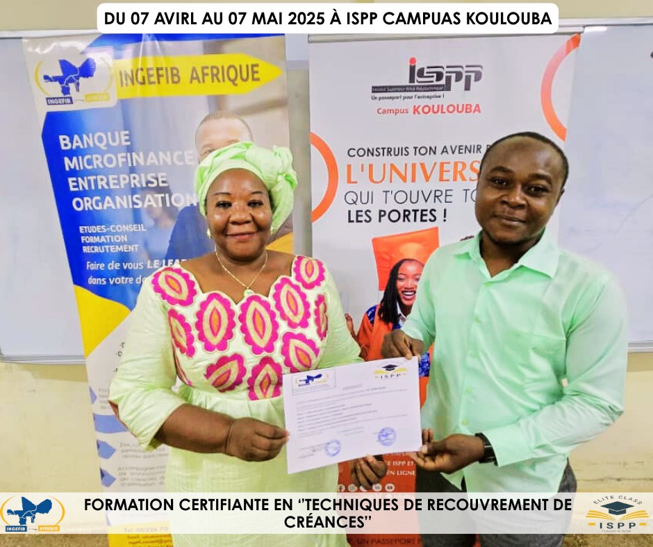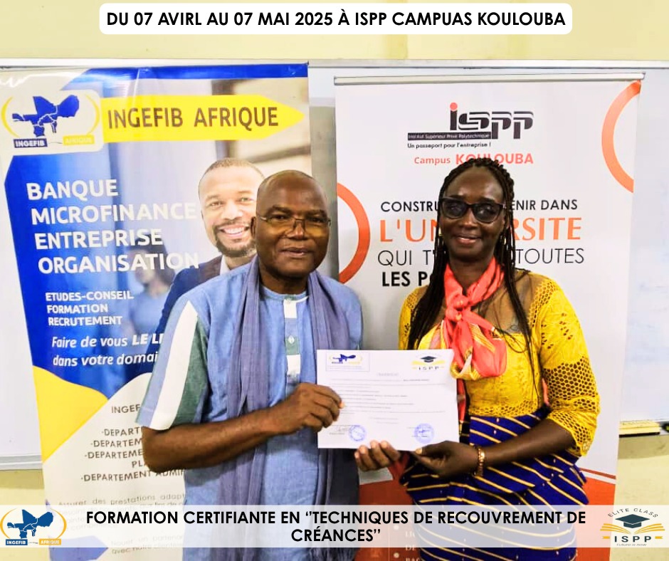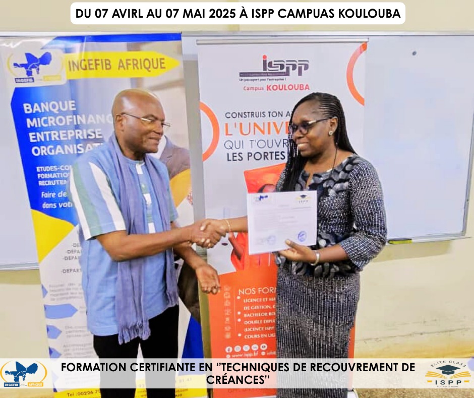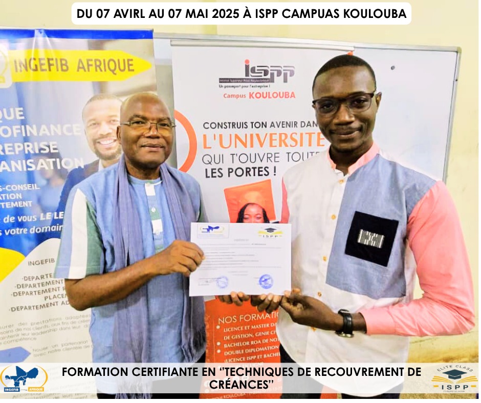 C’était la grande fierté ce soir du 14 octobre 2025 dans la grande salle S1 de l’ISPP Koulouba, où responsables de la formation et Auditeurs se sont retrouvés pour faire le point sur la quatrième session 2025 de la formation menant à la Certification internationale en Techniques de recouvrement des créances. Durant cinq semaines de formation, du 07 avril au 07 mai 2025, Formateurs et Auditeurs ont abordé six modules à savoir: